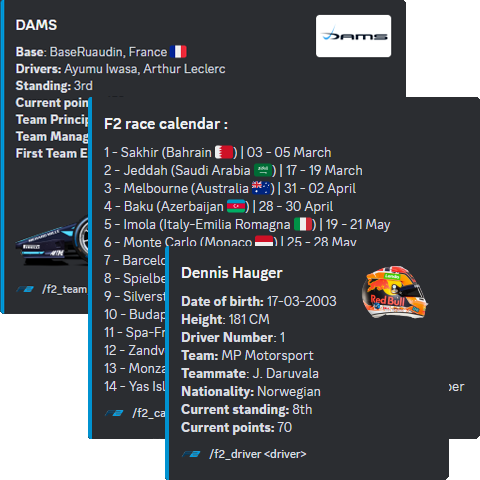 The bot offers commands to find out more about Formula 2, the teams and the drivers.